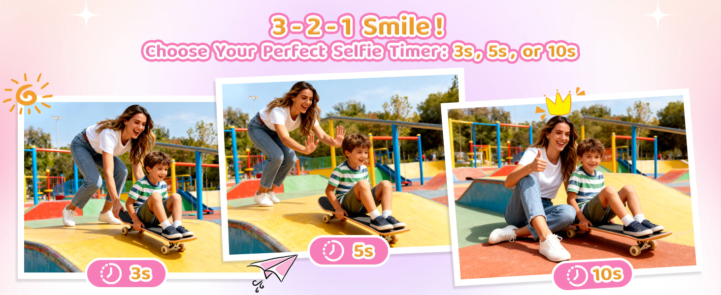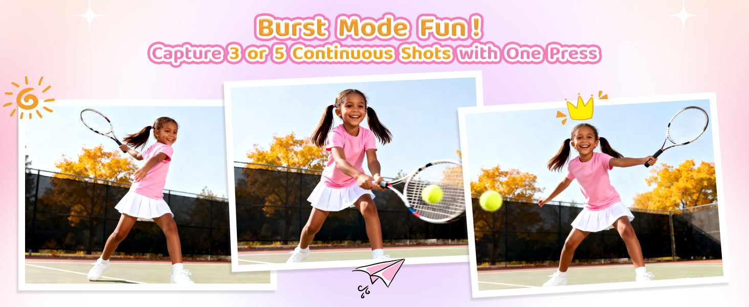 • All-in-One Creative Hub for Kids: More than just a camera, this is a portable creative studio. It features a 2.4-inch large screen for easy framing, 1080P video recording, time-lapse, continuous shooting (3/5-shot burst), built-in games, fun filters & frames, and even an MP3 player. Designed to grow with your child, it satisfies their evolving creative needs and makes for a wonderful companion, capturing happy moments and bringing the whole family together.