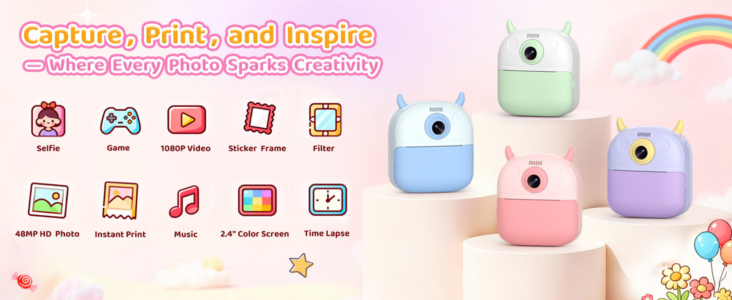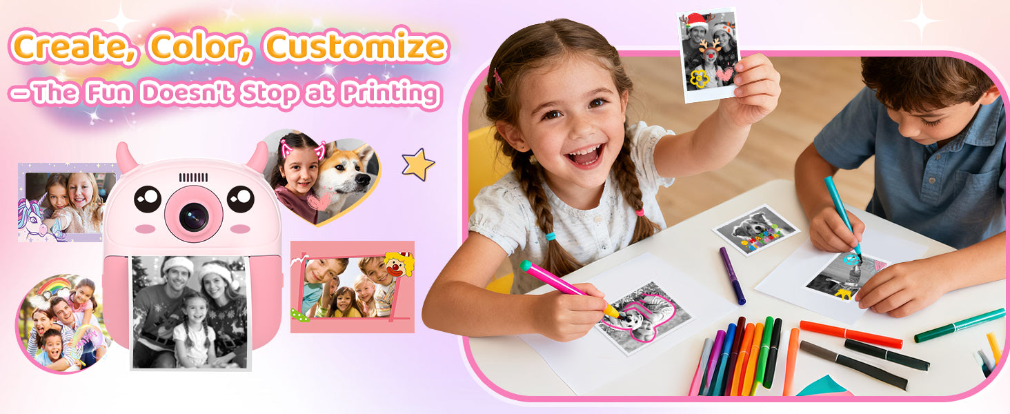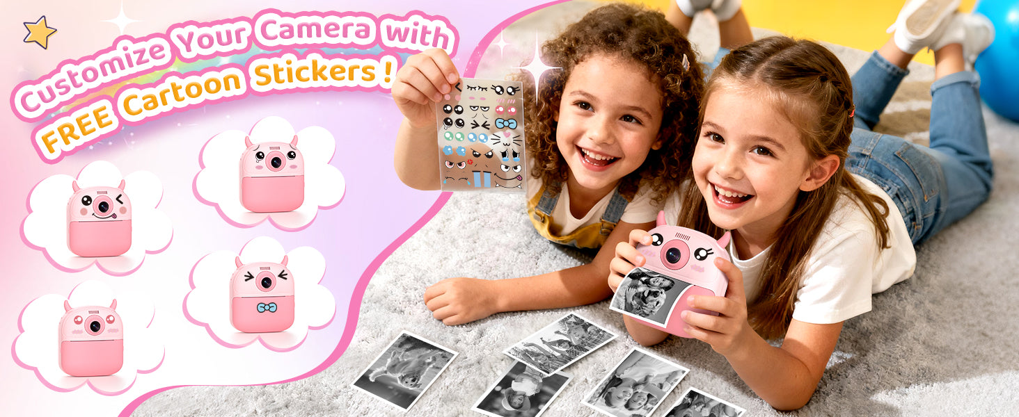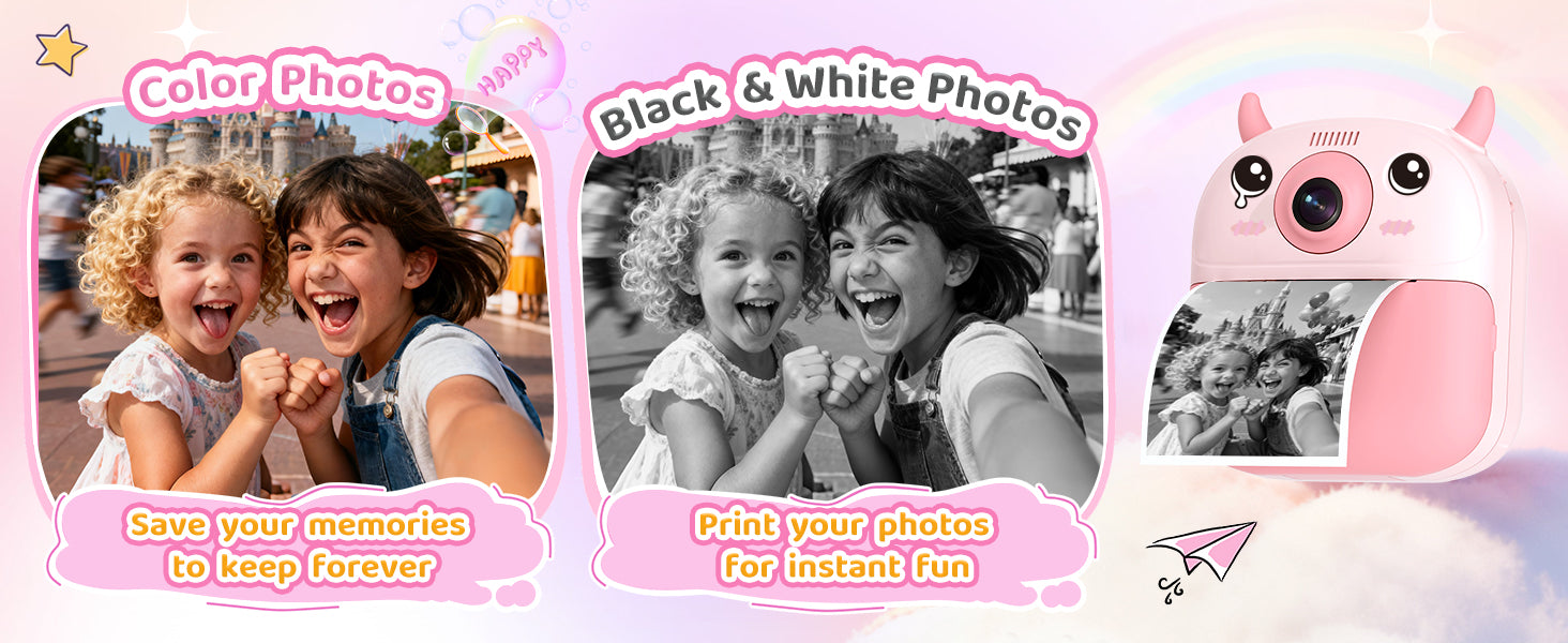 Print black-and-white photos instantly and save colorful memories on the SD card! This kids instant print camera includes 7 filters, 22 fun stickers, and 3 rolls of thermal paper (2 standard + 1 sticker roll) for up to 174 prints — perfect for creative little photographers.