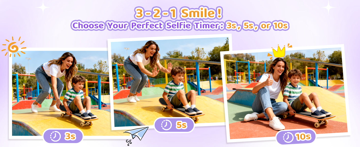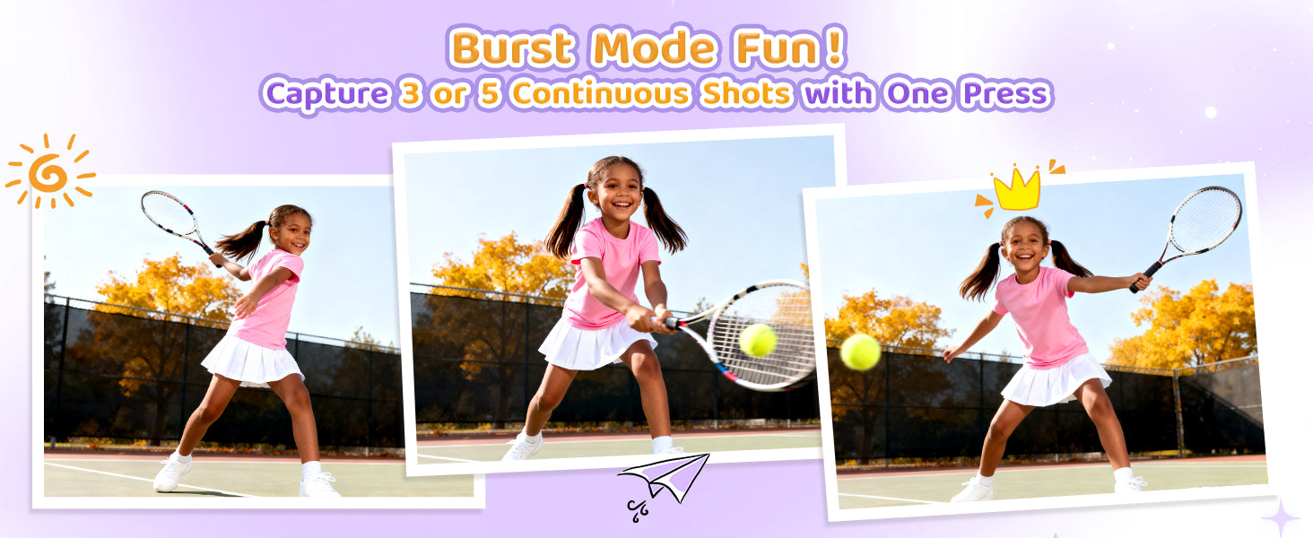 - All-in-One Creative Hub for Kids: More than just a camera, this is a portable creative studio. It features a 2.4-inch large screen for easy framing, 1080P video recording, time-lapse, continuous shooting (3/5-shot burst), built-in games, fun filters & frames, and even an MP3 player. Designed to grow with your child, it satisfies their evolving creative needs and makes for a wonderful companion, capturing happy moments and bringing the whole family together.
