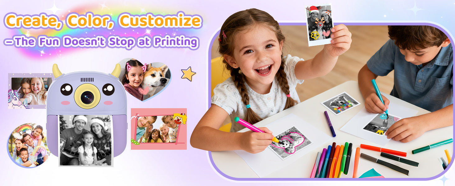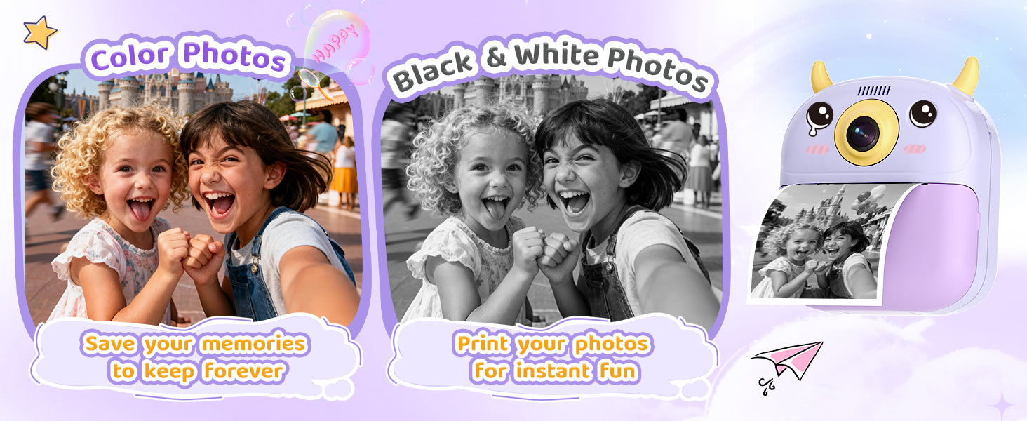 Print black-and-white photos instantly and save colorful memories on the SD card! This kids instant print camera includes 7 filters, 22 fun stickers, and 3 rolls of thermal paper (2 standard + 1 sticker roll) for up to 174 prints — perfect for creative little photographers.