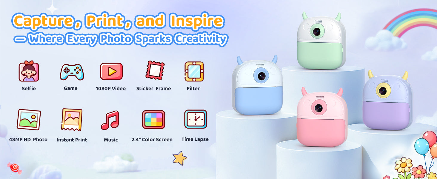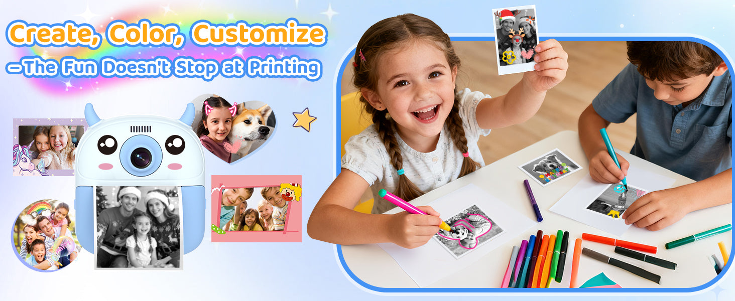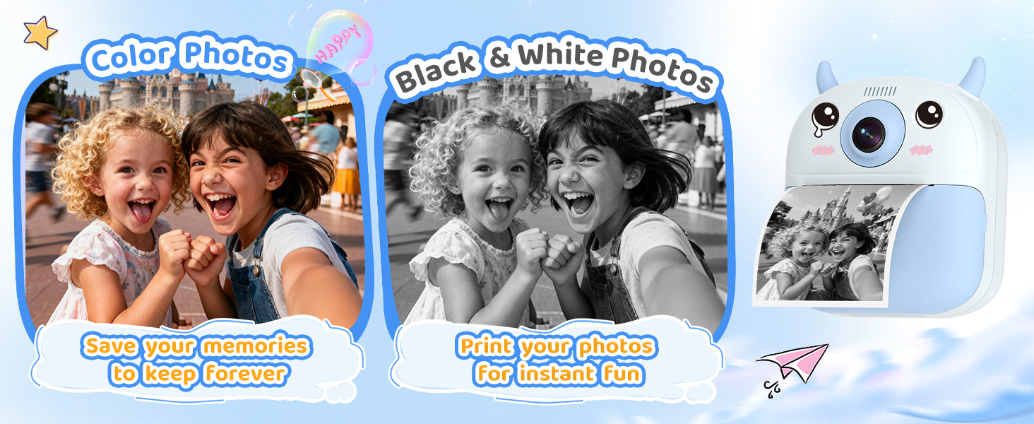• Child-Safe Design for Peace of Mind: Your child's safety is our priority. The camera is made from high-quality, soft-touch plastic with a shockproof shell that withstands drops. Our advanced thermal printing technology requires no ink, toner, or carbon powder, producing odor-free and non-toxic prints that are safe for sensitive skin. Let your children play and create in a completely non-toxic environment, supporting their healthy growth without any worries.
